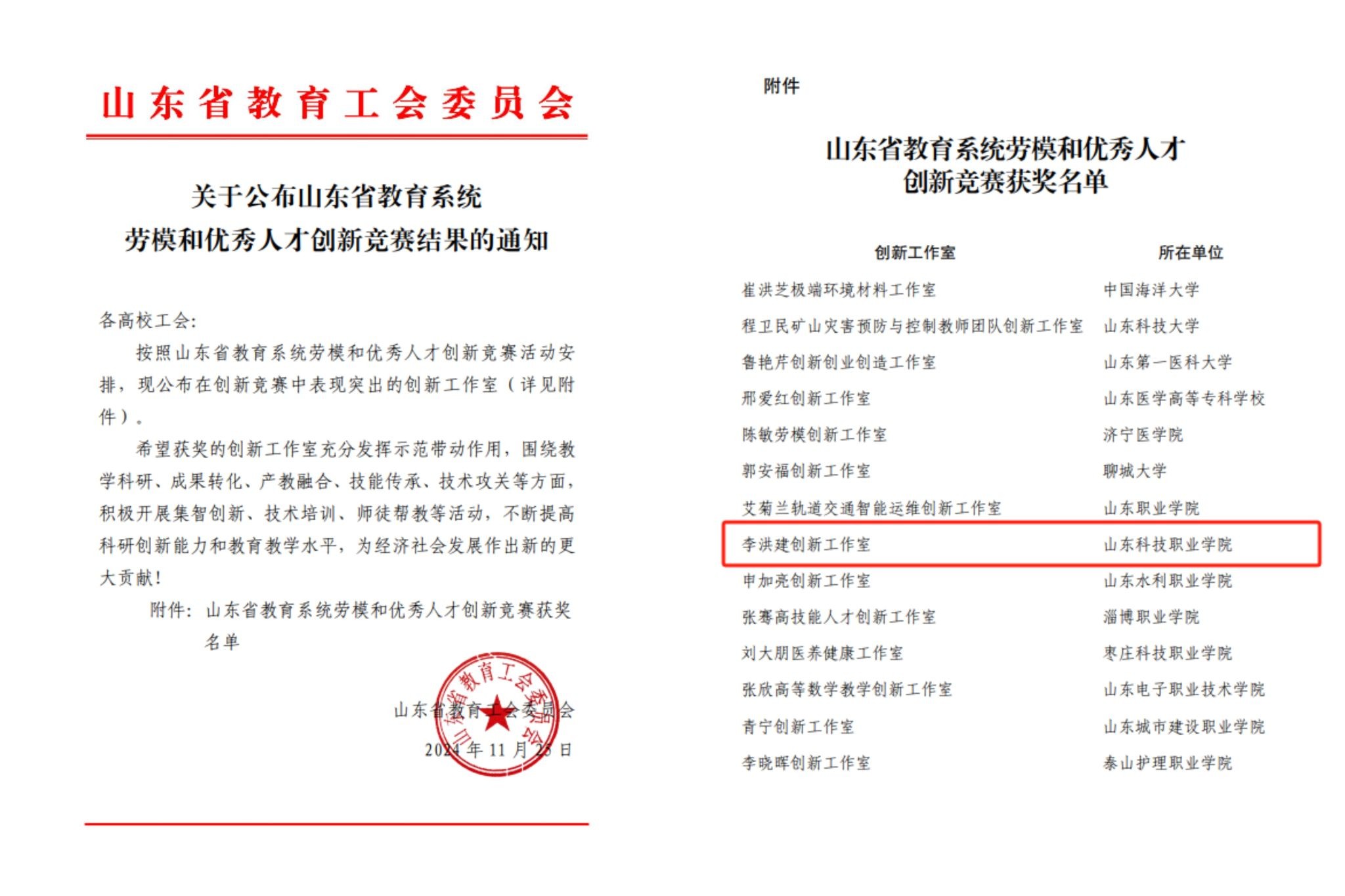 近日,山东省教育工会委员会公布了山东省教育系统劳模和优秀人才创新竞赛获奖名单,本次竞赛全省共有14个创新工作室获奖,我校“李洪建创新工作室”位列其中。