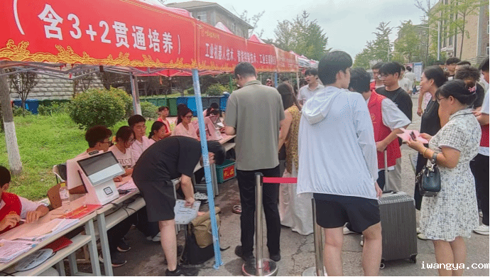 报到台前新生们手持录取通知书和身份证等材料,在志愿者的指引下有条不紊地登记信息,笔尖划过纸张的沙沙声,与轻声交流交织在一起,满是忙碌又温馨的气息。