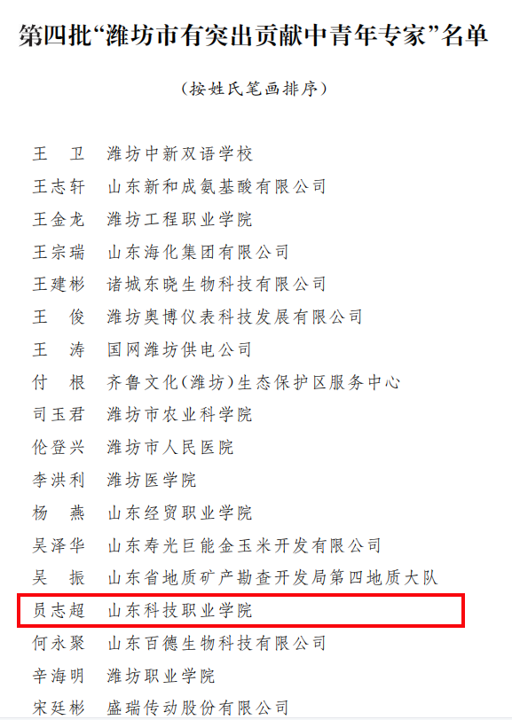近日,潍坊市人民政府公布了第四批“潍坊市有突出贡献中青年专家”名单,我院信息工程系计算机网络技术专业负责人、副教授员志超榜上有名。