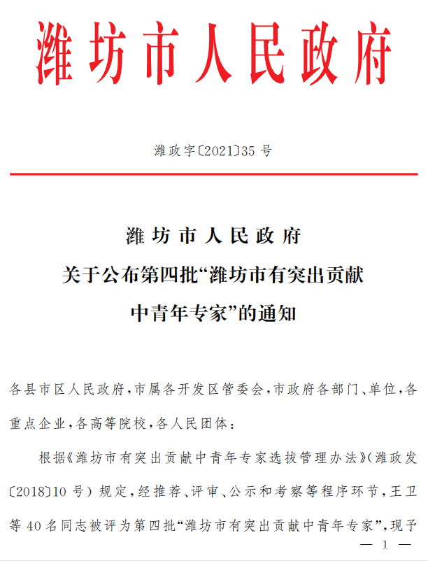 潍坊市有突出贡献中青年专家是潍坊市政府为积极营造优秀人才脱颖而出的社会氛围,高层次创新型人才队伍建设不断取得新成效而设立的专业技术人才专项荣誉。选拔对象为长期在潍坊市自然科学和社会科学各学科各领域以及经济、社会发展各行业专业技术岗位上工作,为全市经济社会发展做出突出贡献的中青年专业技术人才。